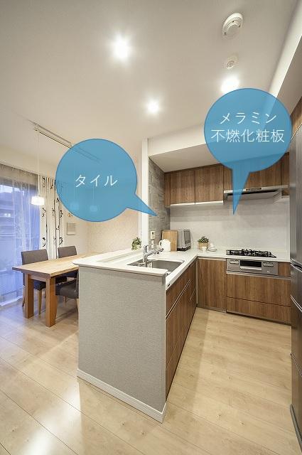 キッチンまわりの壁には『キッチンパネル』『キッチンボード』と呼ばれるメラミン不燃化粧板がよく使われます。これは不燃材にメラミン樹脂加工をしたもので、お手入れのしやすさ、施工性のよさが特徴。S様邸でもコンロのまわりに使っています。ダイニングに面した調理スペース前の壁はタイル。色、柄、形のバリエーションが豊富で、ひと味違うキッチンにしてくれると人気のタイルですが、お手入れと費用の面がネックになることも。今回は奥様がキッチンカタログでご覧になったイメージ写真のタイルを気に入られ、ぜひこれと同じにしたいとのリクエストがありました。メリット・デメリットをふまえてお打ち合わせした結果、汚れやすいコンロまわりと、コンロまわりほどは汚れないであろう調理スペース前とを貼り分け、タイルも楽しめるようにしました。