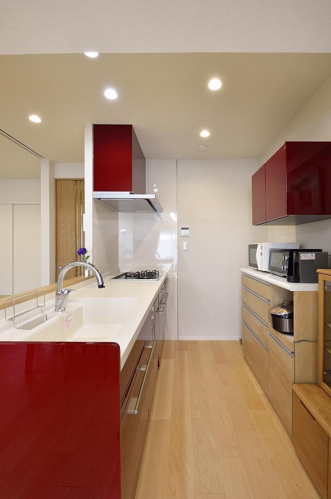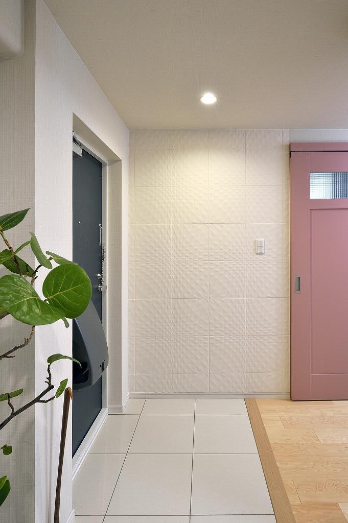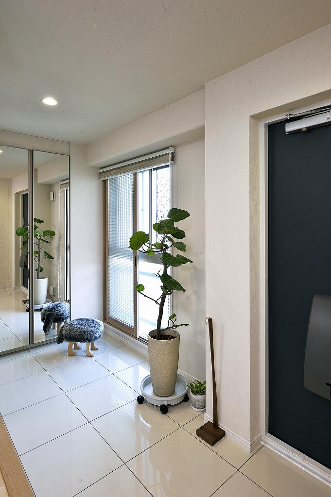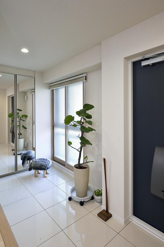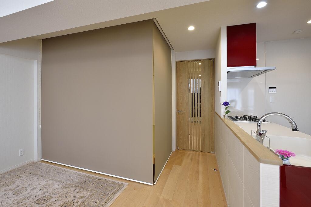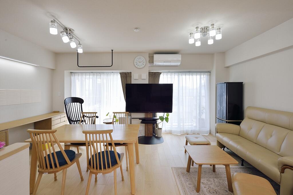 水周り設備すべての交換を検討していたYさま。リフォームをするなら仮住まいの必要性があり、それならと全面リフォームに踏み切られました。ご夫妻のライフスタイルに合わせて間取りを見直し、リビングの隣にあった洋室を取り払って明るくオープンな空間へと再生。壁面にはリモートワークに便利なデスクが置けるようになりました。ダイニングだった場所は収納を兼ねた小上がりの畳コーナーに変更。息子さんが帰省される時にはゲストルームとして使えるようにロールスクリーンも取り付けています。壁付けのキッチンは対面キッチンに変えて家族とコミュニケーションを図りやすいスタイルに。床には木肌の美しいハードメイプルのフローリングを合わせ、和モダン風とクラフト風の建具をミックス。キッチンカウンターやデスクコーナー、畳コーナーの壁面の一部にはエコカラットをデザイン貼りし、くつろいで気持ちよく過ごせる空間へと様変わりしました。また玄関も洋室の一部を採り込んで広くて明るい空間へと一新。玄関収納の扉は鏡にして姿見を兼ねたほか、壁面には上品なホワイトのエコカラットを合わせて上質感あふれる空間となりました。共用廊下側の窓にはチェッカーガラスの内窓を取り付け、断熱と遮音性を向上。また、電気温水器をガス給湯器へ変更し、収納スペースをしっかり確保しました。トイレや収納にはキャラクターデザインのクロスを合わせるなど、遊び心のある仕上がりとなっています。