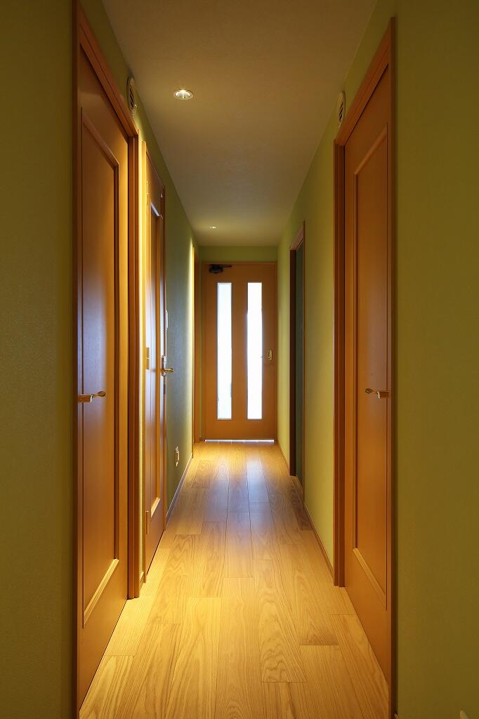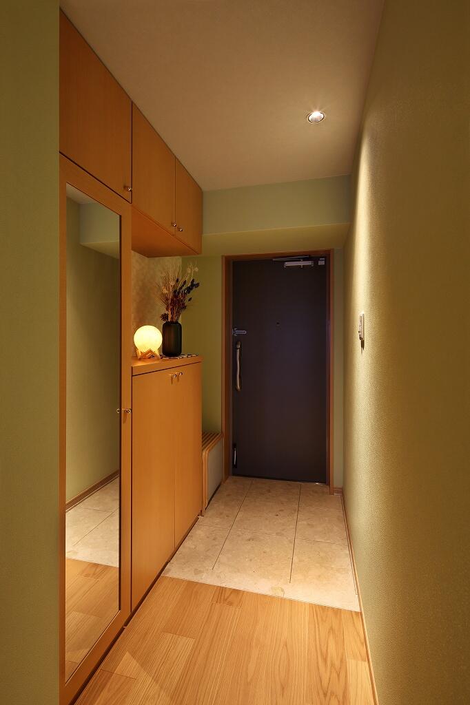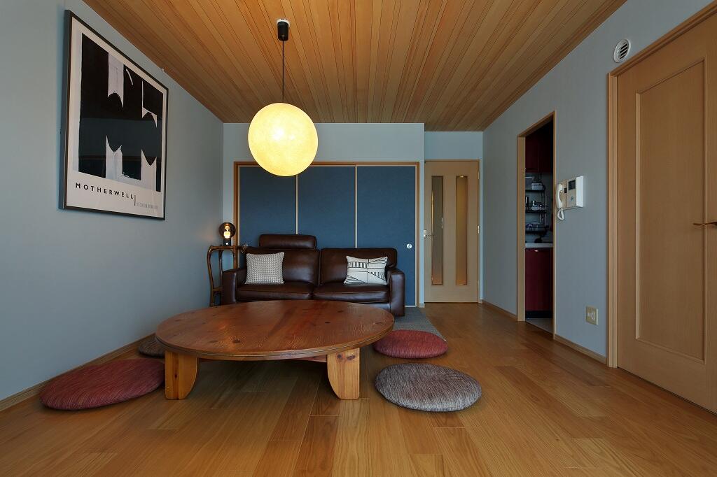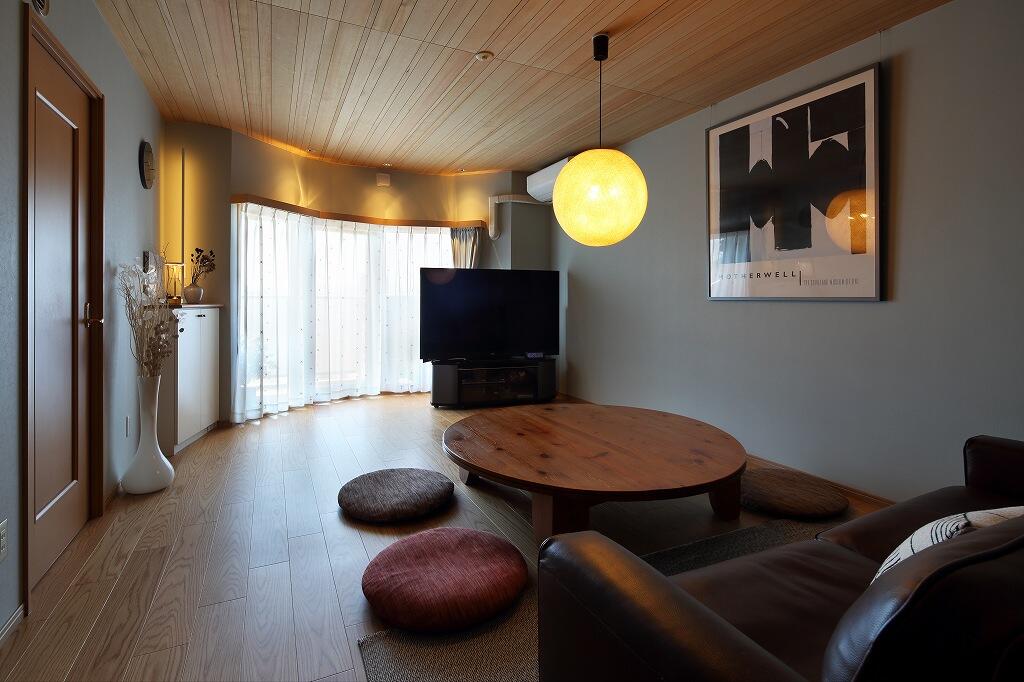 お子様が独立され夫婦二人暮らしのリスタートに伴い、住まいも新たに雰囲気を変えて、「ワクワクする家」にしようとリフォームを決められたI様。お手持ちの家具や照明器具、絵画が映えるような、和モダンの住まいをイメージされていました。I様の好みの空間に合いそうな木の素材にこだわったメーカーをオススメし、ショールームにご案内してじっくりと商品を選定されました。そうして仕上がったのが、肌触りのいい無垢の床材を取り入れた木の温かみが感じられるモダンなリビング。元々天井には考えていませんでしたが、ショールームで実際に見て感銘を受けられ、天井にも無垢材を合わせたことで、より上質感が感じられる空間へと様変わりしました。天井や床との相性もいいダウンライトを窓の上に合わせ、オシャレな色味のクロスをアクセントにするなど、「なにこれ!」の、こだわりいっぱいの空間に生まれ変わっています。また玄関ホールと廊下もクロスを変えてダウンライトの位置を調整し、モダンな表情に。「フローリングの肌触りがよく、スリッパを履きたくないほど。素足で気持ちよく過ごしています」とI様。お手持ちの照明や家具が映える空間に居心地の良さまで叶えて、自宅での時間を楽しまれています。