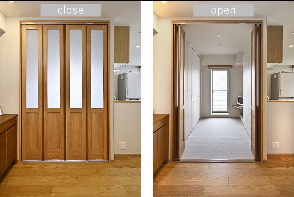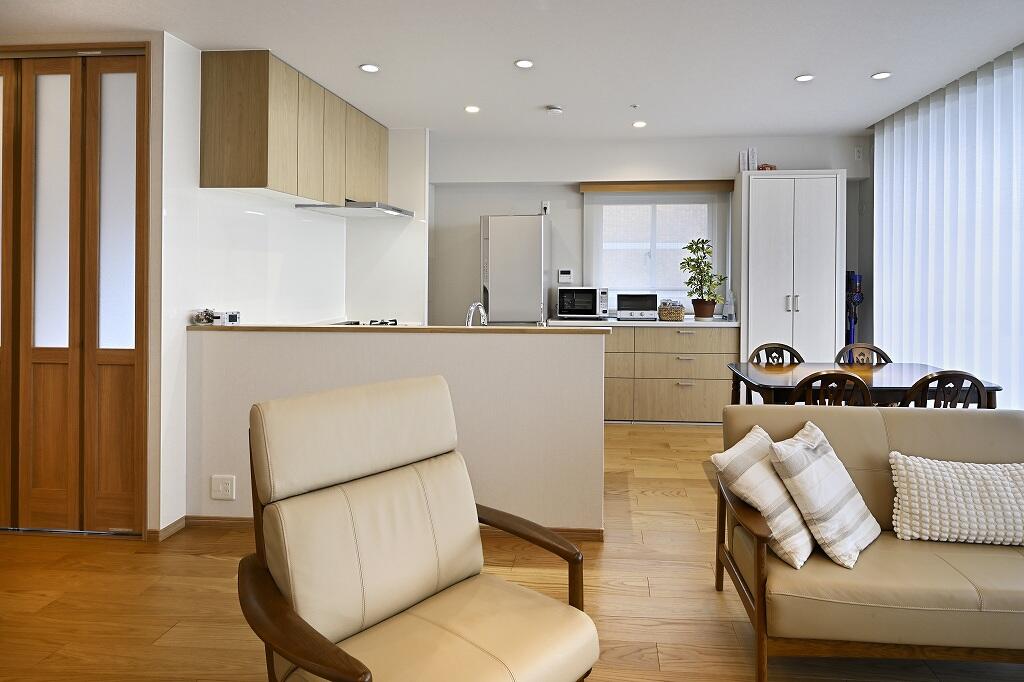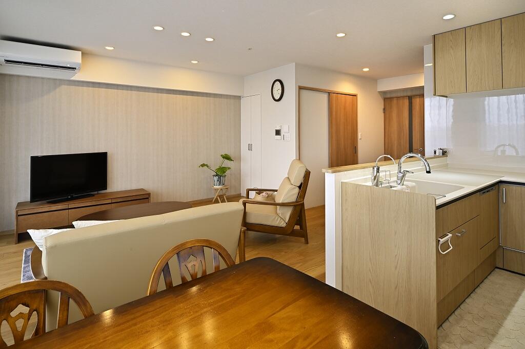 お子様の独立を機に、夫妻が心地よく過ごせる住まいにしようとリフォームを決められたK様。情報収集を進めながら数社に見積もりを依頼し、女性目線かつ主婦目線の提案が気に入った当社を選ばれました。ご主人が一番こだわっていたのは、リビングに抜け感を出して広々とした空間を作ること。そこで既存の和室をなくし、浴室などの水まわりの配置を見直して洗面室をリビングに取り込んだ、開放感が感じられるプランを提案しました。リビングに抜け感が生まれるとともに、暑くて化粧ができなかった洗面室も快適に過ごせる空間に生まれ変わっています。キッチンはリビング全体を見渡せるように位置を変えてオープンなスタイルに。余った場所にはトール収納を備え付けて収納力もアップさせました。3つ並んでいた洋室も見直し、中央の洋室は一人でくつろぐ時間を希望していた奥様の部屋とし、お子様家族の帰省時には泊まれるように広めに設計。そのほか、手持ちの家具や物に合わせてピッタリの収納も実現するなど、気持ちよく暮らせる住まいへと一新。「キッチンに立つのが楽しくなりました」と生まれ変わった住まいで、日常を楽しまれています。