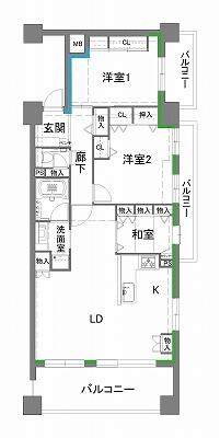 - リビングダイニング、キッチン、洗面、浴室、収納、トイレ、寝室、玄関/廊下