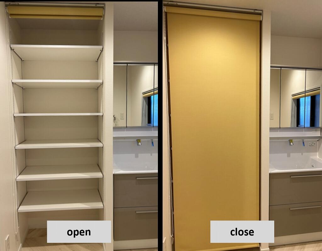 1階部分は間取りを見直して無駄をなくし、ワンルームのゆったりとした空間へと再生。洗面室やトイレはリビングの雰囲気と揃えて一体感が感じられる仕上がりとなっています。パントリーや洗面室の物入れにはローススクリーンをご提案。扉より場所を取らないため収納を広く確保でき、来客時には閉めてすっきりと見せることができるようにしました。
