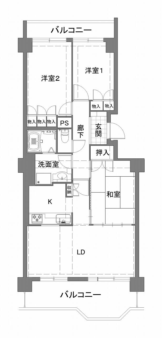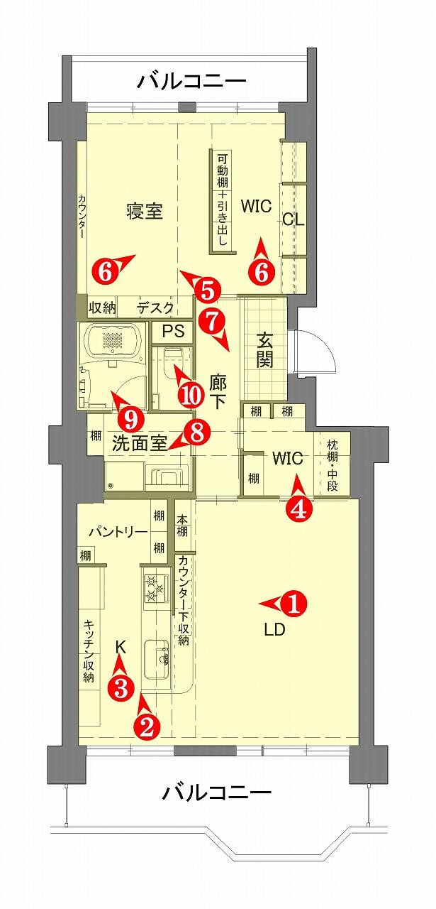 - リビングダイニング、キッチン、洗面、浴室、収納、トイレ、寝室、玄関/廊下