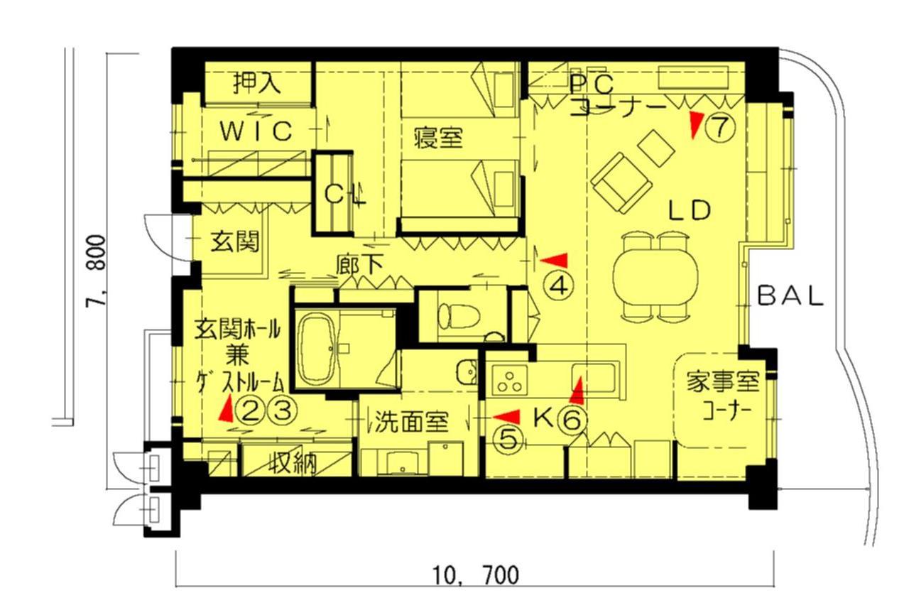 居室・水回り・収納もゆったりととり、回遊できるように各室を配置しています。また年齢を重ねていくことを意識して床段差ができないハンガー扉を採用しました。キッチン横のバルコニー側には家事コーナーをテレビの横にはパソコンコーナーを設け広いLDKで夫婦二人がそれぞれのコーナーでお互いの気配を感じあいます。