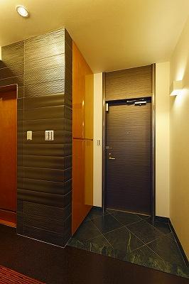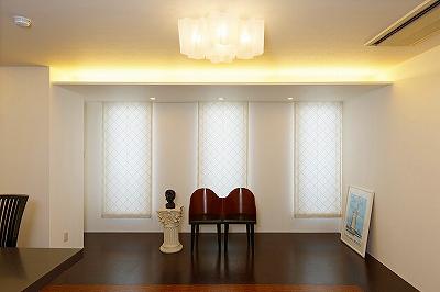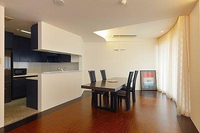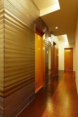 アシンメトリーとは意図的にデザインされた左右非対称の形状を意味します。ご夫婦は、非日常的な感覚が欲しいといご要望を持っておられました。そこで、このアシンメトリーを廊下に採用し、ドラマティックな廊下が生まれました。