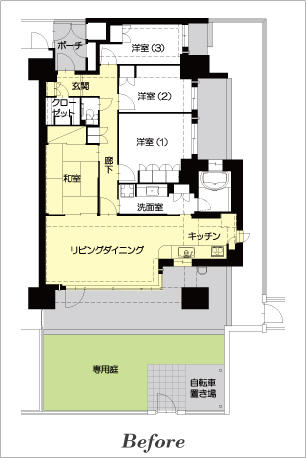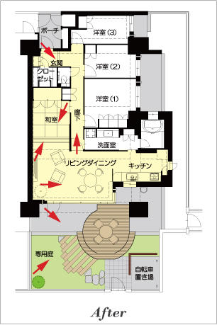将来に備えてマンションを購入されたS様。廊下からリビング、そして専用庭まで広がる空間が購入の決め手だったそうです。S様は初めから、専用庭をいかすこと、そしてありきたりな仕上げ材ではなく、デザイン性のあるものにしたいという具体的な希望をもっておられました。そのS様のご希望にそった、デザインあふれるリフォームとなっています。