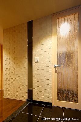 玄関の正面になる壁。エコカラットとミラーを張って表情のある壁にしました。タイルの半端ものが出ないようにミラーの巾で調整。シュークローゼットへの入り口扉は稲穂がサンドイッチされたアクリルガラスに変更しています。ミラーの奥行き感と扉の透け感は、玄関の圧迫感をなくす仕掛けとなっています。