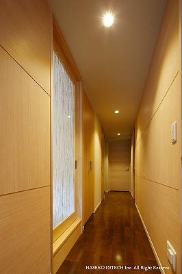クロスをデザイン張りした廊下。クロスを市松張りにし、そのジョイント部分には目地をいれています。やわらかい印象の木目クロスが目地により引き締まったものへと感じられます。左に見えるアクリルガラス入り引き戸は和室へとつながっています。天井のダウンライトは、S様ご自身でLEDタイプに取替えられました。