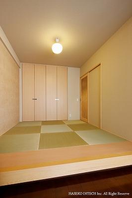 暗かった和室は思い切ってリビングとの間仕切壁を取り払いました。リビングと大きく段差をつけて、部屋の間口と高さのバランスを保っています。押入れの襖を天井までの開き扉に変更し、半畳のたたみを敷きこんで、リビングとバランスをとった、おしゃれな和室となっています。