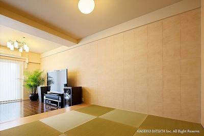 和室からリビングへと続く大きな壁には、大判のエコカラットを貼り、風格を演出しています。現場での割付にはS様も参加され、その苦心が感じられる出来ばえになっています。