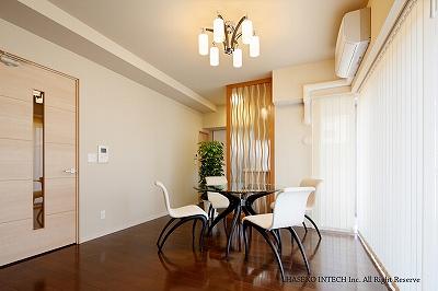 キッチンの目隠し用に天井までのパーティションをたてています。このパーティションはスライスされた木がサンドイッチされたアクリルガラスをセレクトしました。デザイン性のあるパーティションは、ダイニングのアクセントにもなっています。