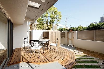リビングから続いている専用庭。地面との段差をうまく活かして、木製ウッドを円形のステージ風に設えました。また、リビングから庭までの雰囲気を壊さないように、自転車置き場を木調のフェンスで隠しました。ウッドデッキ、枕木、飛び石、芝生というさまざまな素材がうまく調和し、とても落ち着いた空間をつくっています。足元のLED照明はS様がご自身で取付けされ、夜には、また違った雰囲気を味わうことができます。