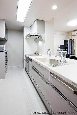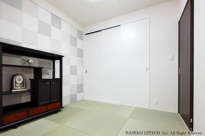 リビングは、バルコニー側の洋室を取り込んで広げ、さらにオープンキッチンを介してキッチンとリビングの空間をつなげました。また、和室もリビングと一体感を感じられる空間にしたい、というご希望から同色の調湿タイルを壁に貼り、リビングと和室が視覚的につながるように配慮しています。兼ねてからストレスに感じられていた収納は、再考し、以前より使い勝手の良いものに生まれ変わりました。