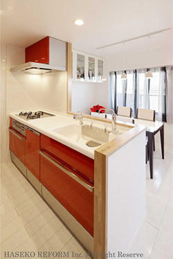 赤と白の色、そしてサイズに特にこだわりを持たれ、何度も打合せを重ね、さらにサンプルや現地の確認などF様自ら熱心に行動されました。妥協せず、徹底してイメージを追求されたこだわりの住まいは、絶妙なカラーバランスの中、無駄のない落ち着いた家になっています。