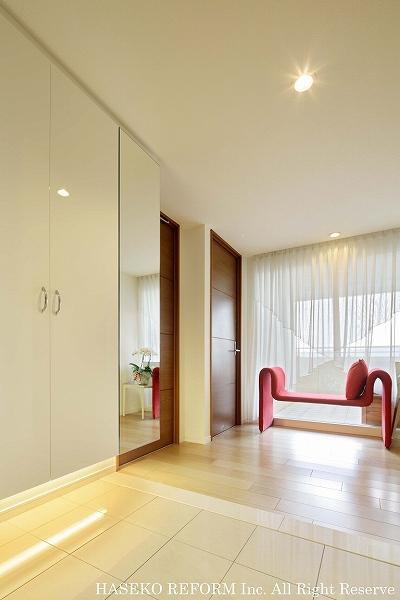 玄関横の洋室は廊下部分も取り込んで、再レイアウト。一室は家族共用のウォークインクローゼットに変更し収納を確保しています。