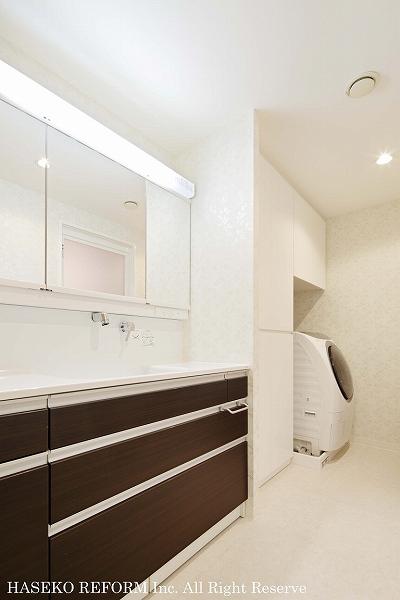 そこで、水まわりから和室6帖の部分は、浴室のサイズを1620から1418にサイズダウンし、洗面化粧台も2ボウルから1ボウルへと水まわり全体をコンパクトにしました。これにより生まれたスペースと旧押入れ部分を合わせて納戸にし、残りで和室4.5帖を確保しています。