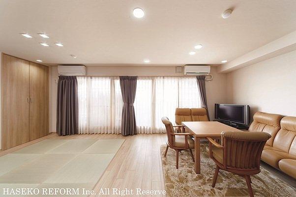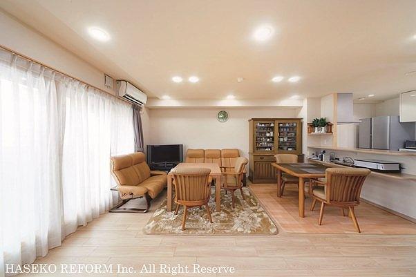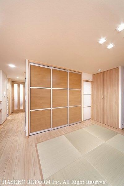 そこで、壁などを取り払いスケルトン状態にしてリフォームを開始。広々としたLDKを創り出し、一部は畳を囲むようにフローリングをレイアウト。和室の機能を残した明るくオープンなLDKと生まれ変わりました。使っていなかった洋室は思い切ってウォークインクローゼットに変更。玄関は広げて、廊下と洋室からどちらにも行き来ができる2WAY仕様に。断熱対策も行い、省エネで快適に暮らせるように配慮しています。