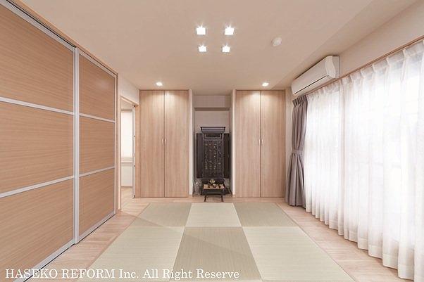 和室の機能を残した、オープンなLDKを希望されていたので、仕切りをなくして琉球風畳をフローリングで囲むようにレイアウト。すっきりと片付けられるように収納も確保し、明るく広々としたLDKをご提案しました。段差をできる限り解消して廊下には手すりも設置。動きやすさにこだわったほか、窓はすべて二重窓にすることで、断熱性を高め、快適に暮らせる空間となるよう心掛けました。(担当:大阪店)