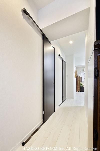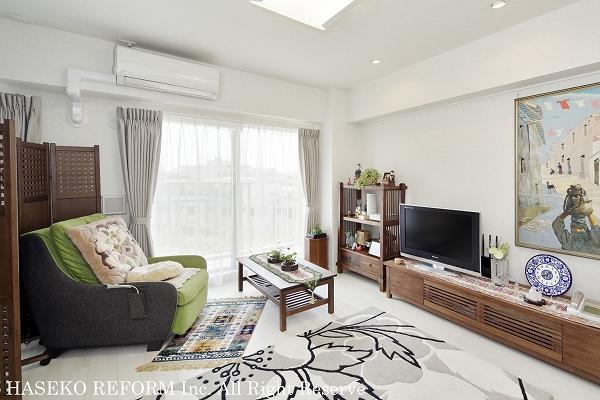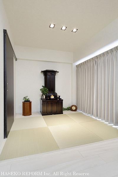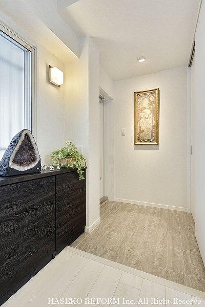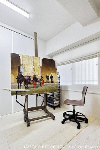 そしてさらに、K様は「絵を制作し、それらを収納したり、飾ったりできるようにしたい」というご要望もお持ちでしたので、北側の洋室を大型の作品を収納できる物入を備えたアトリエにしました。絵が主役になるようにと、壁も床もオフホワイトでまとめ、そのなかでグリーンとダークブラウンをさし色に使用したカラーリングにもこだわったリフォームとなっています。