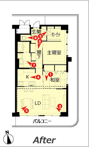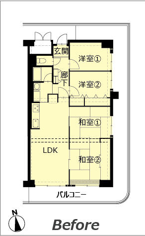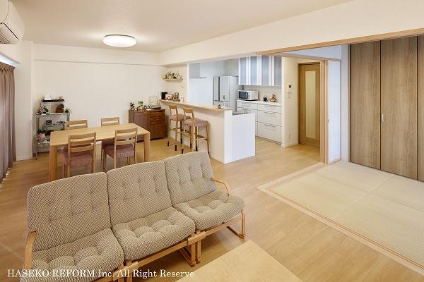 Y様のご要望は、お子さんたちが帰省された時やご両親が遊びに来られた時のために和室を残すこと、キッチンは対面にすること、トイレ以外の水まわりはすべて取り替えることの3点でした。また、夫婦二人暮らしのため部屋数は必要がないとのことで、それ以外の部分は当社からの提案を希望されました。