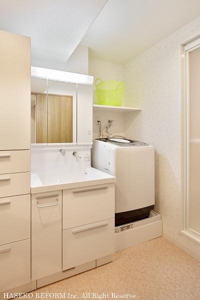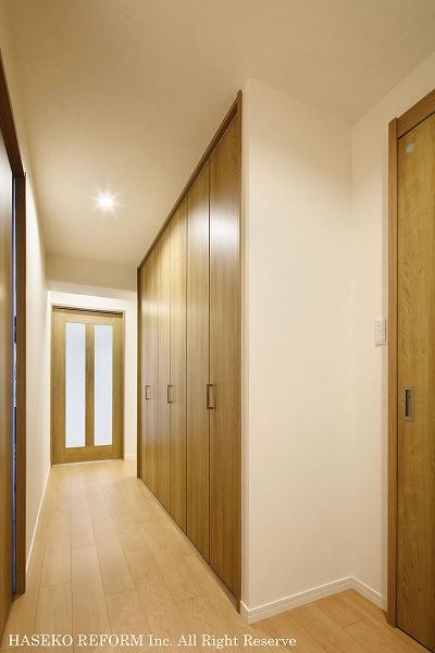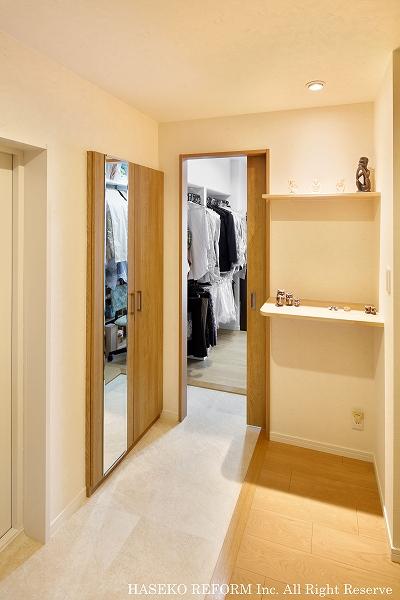 そこで、南東に窓を有した間取りをいかして、南側に広いLDKをつくり、ここに面してコーナー和室を設えました。和室は、普段は障子を開けてリビングの一部として使用するので、LDKと一体感を感じられるようにと、ナチュラル系のテイストでまとめています。細かく仕切られていた洋室部分には、主寝室とクローゼットを配置。クローゼットは主寝室からは建具のない入り口から出入りし、さらに玄関からも出入りが可能です。水まわりは以前より大きいサイズのものに取り替えて、各室がゆったりと余裕のある空間に生まれ変わりました。