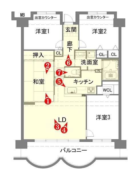 - キッチン、リビングダイニング、和室、洗面/浴室/トイレ、玄関/廊下