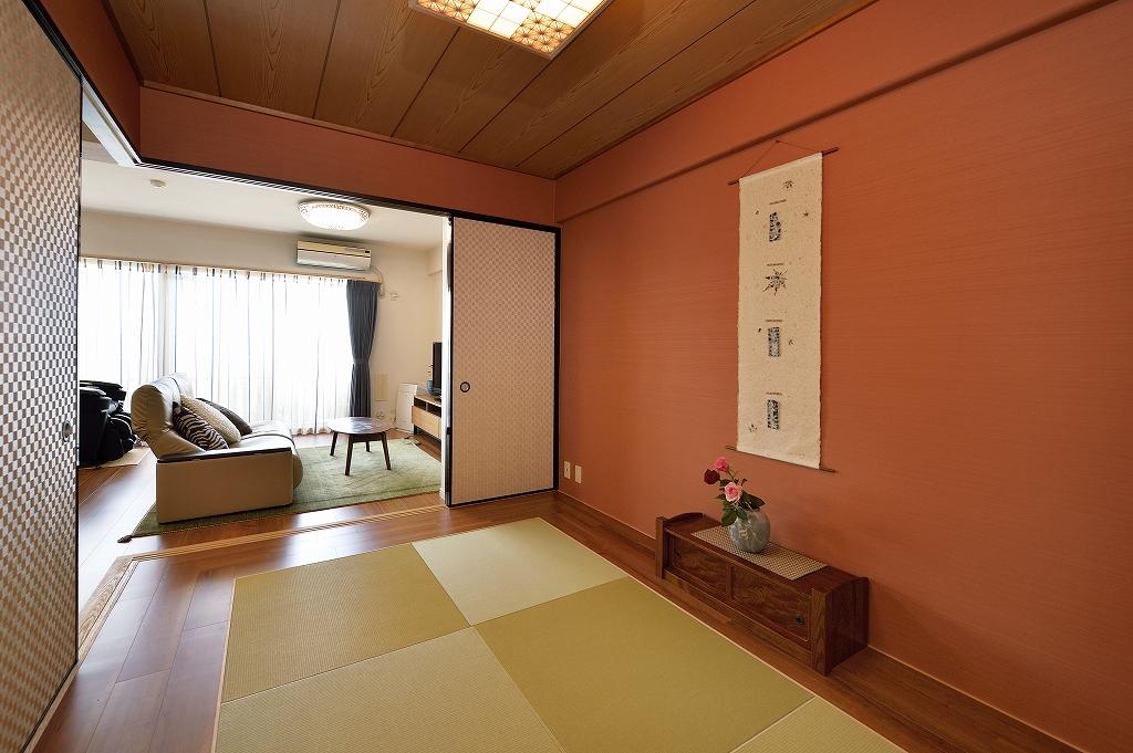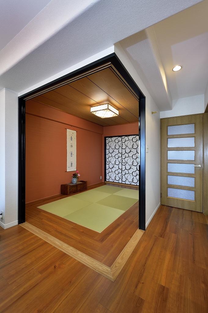 イメージを忠実にカタチにするため、壁は朱色、建具の枠はすべて黒く塗り、畳を囲うようにリビングと同じフローリングを貼りました。押入や間仕切りの襖には柄物をうまく組み合わせて楽しまれています。