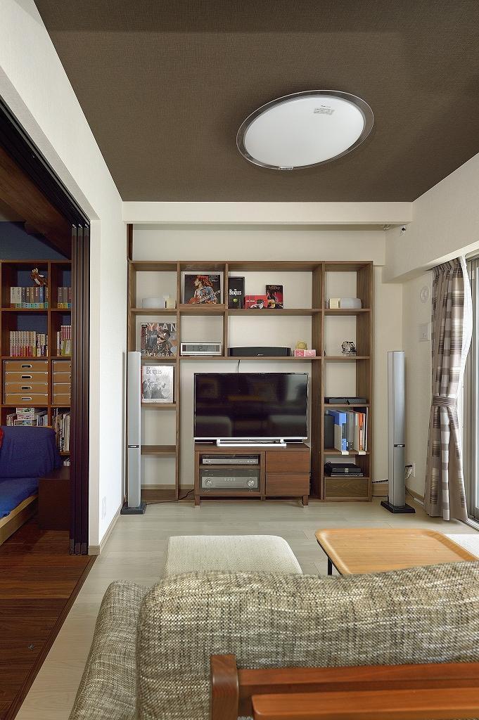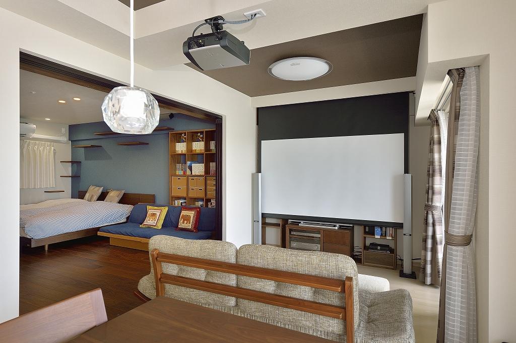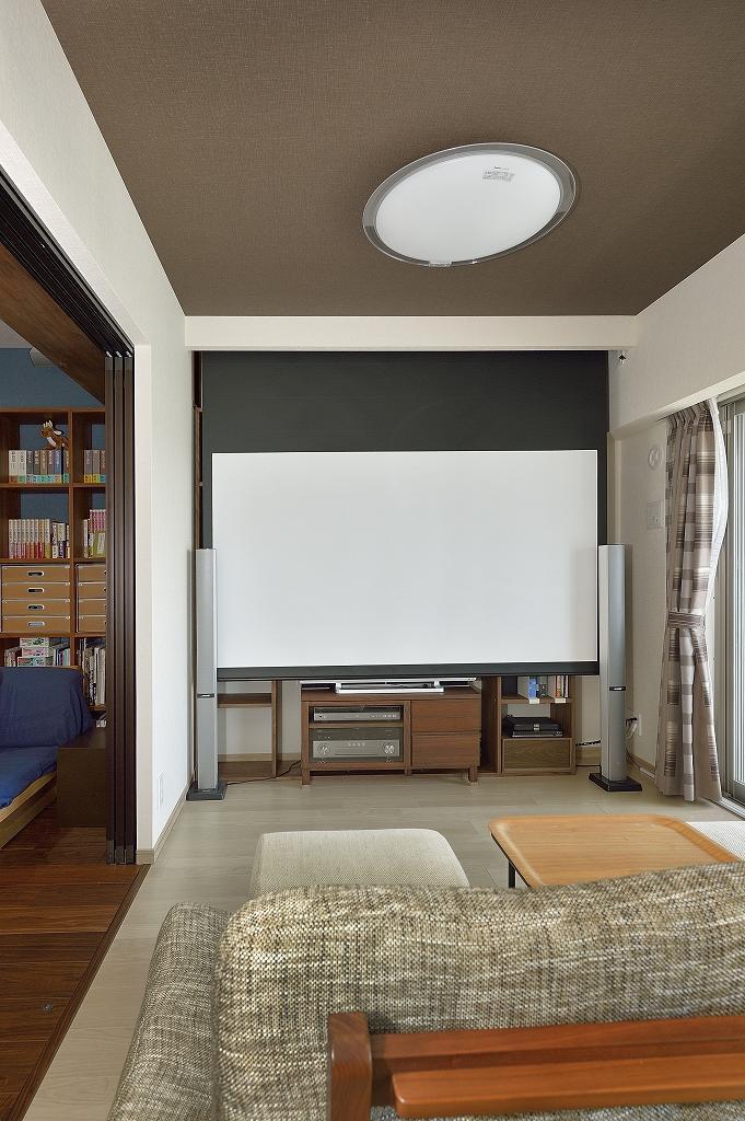リビングにはホームシアターの機材も組み込み、機能面もバージョンアップ。より充実した滞在時間を楽しまれています。
