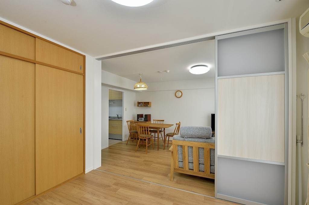 和室の敷居部分も撤去し、バリアフリーにして、すべての扉を開け放つと開放的なリビング空間が広がります。別途置き敷きの畳を準備することで、和室としての機能も保ちつつ、お孫さんのためのキッズスペースにもなり、よりフレキシブルな空間となりました。将来は、ご夫妻の寝室としてベッドを置くこともお考えです。