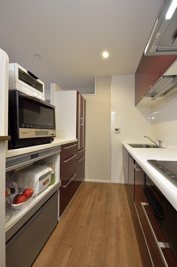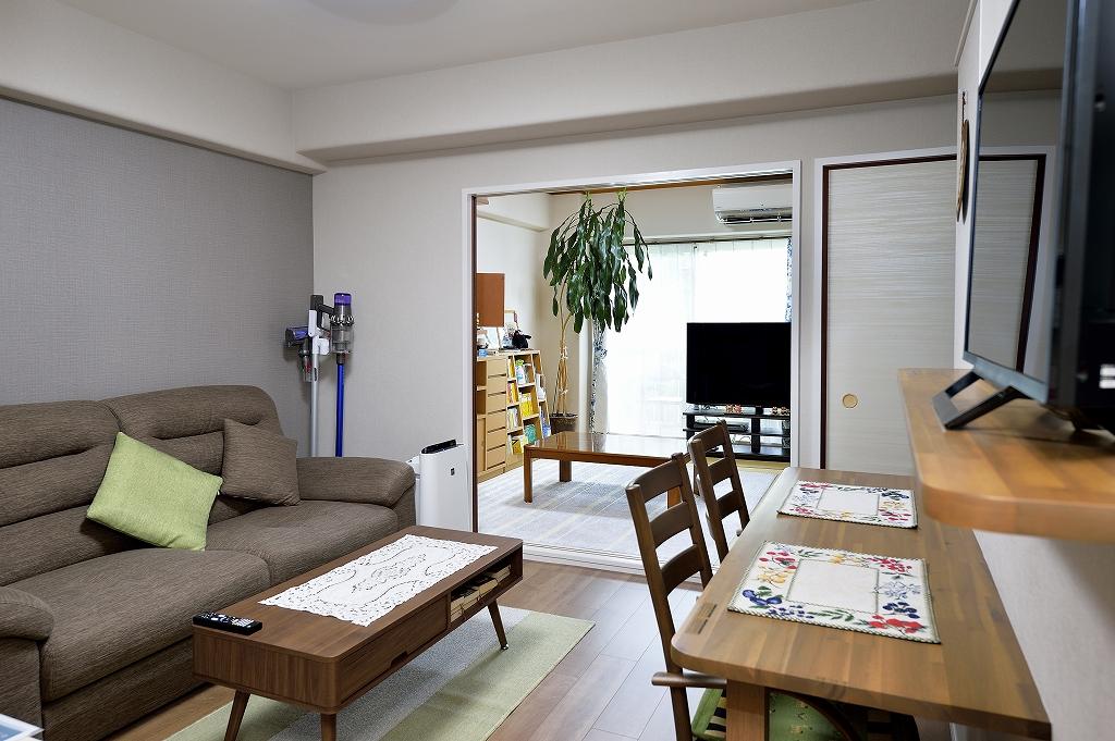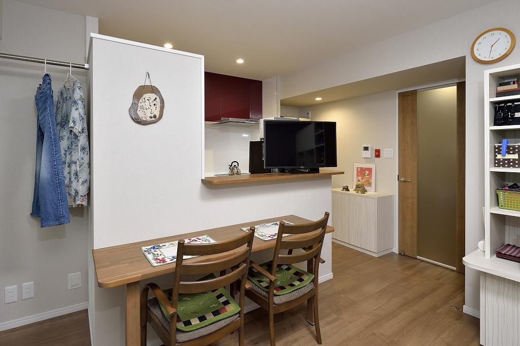 生活のしやすさと、歳を重ねた時の動きやすさを考えてリフォームされたH様。まずは壁付けのキッチンを一新して、安全に使えるようにガスコンロからIHクッキングヒーターに変更されました。電気温水器をガス給湯器に変えたことで冷蔵庫スペースも確保でき、すっきりとしたレイアウトに。さらにカウンターと食器棚を配して機能性を高めるとともに、食卓カウンターも造作し、作ったものをサッと配膳して食事ができるようになりました。食器棚の背面が見えないようにカウンターの続きに造作した壁は、あえて天井まで作らないことで換気にも配慮しています。カウンターにはテレビを置いて、ご夫妻二人並んでテレビを見ながら食事ができるようになったと喜ばれています。