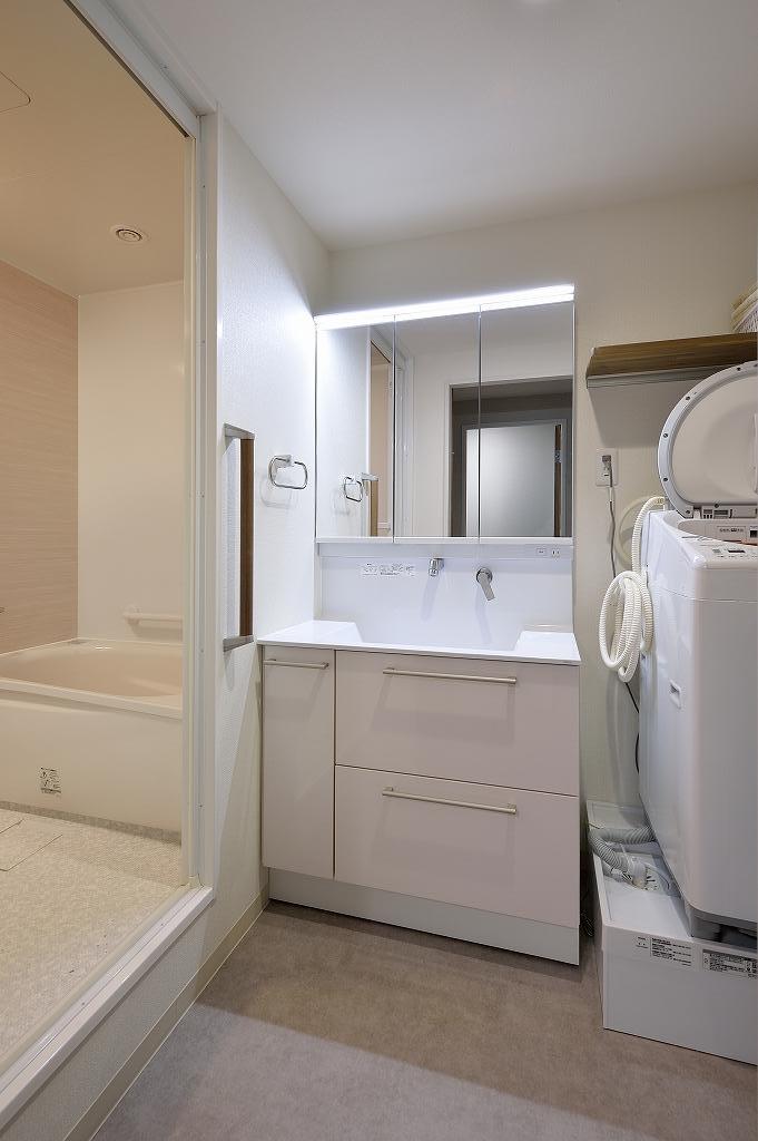 廊下も広くして手すりを取りつけたほか、洗面室との床高を合わせて段差も解消。洗面室も拡張して洗面化粧台も一回り大きなサイズに変更したほか、浴室は最新のタイプに一新しました。低床で滑りにくく、またぎやすい浴槽になり、手すりも設置。安全で気持ちよく暮らせる住まいへと様変わりしました。
