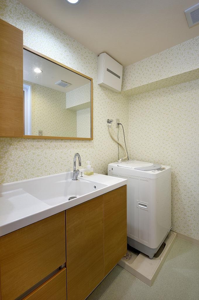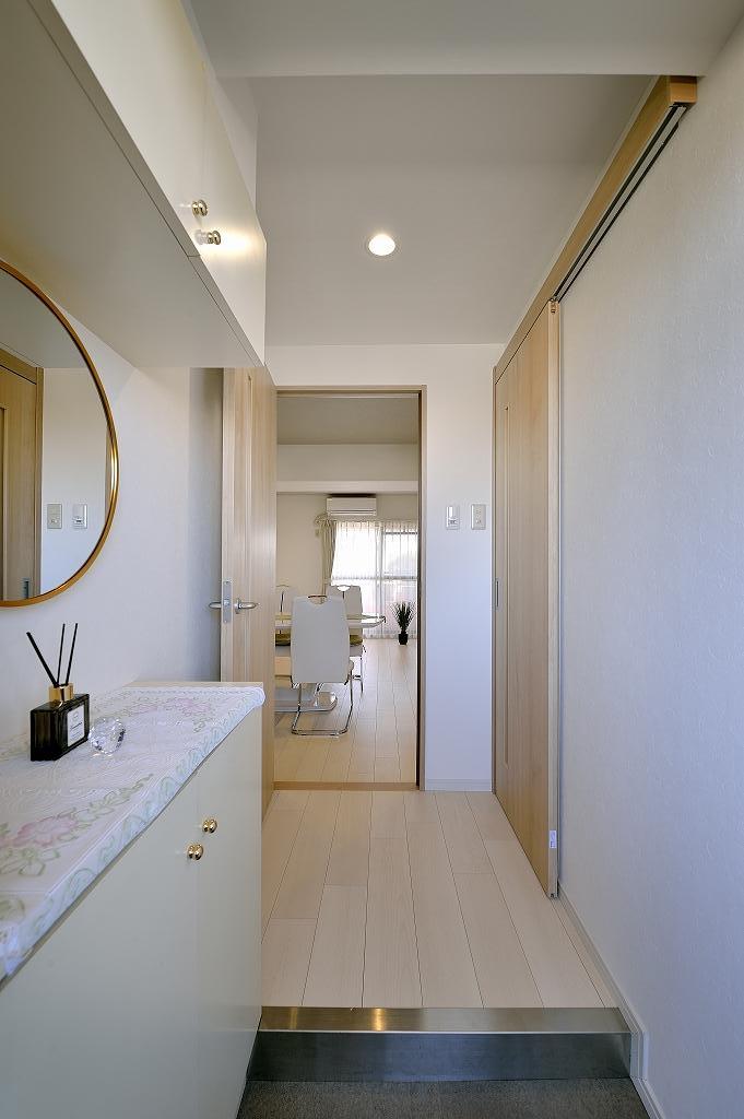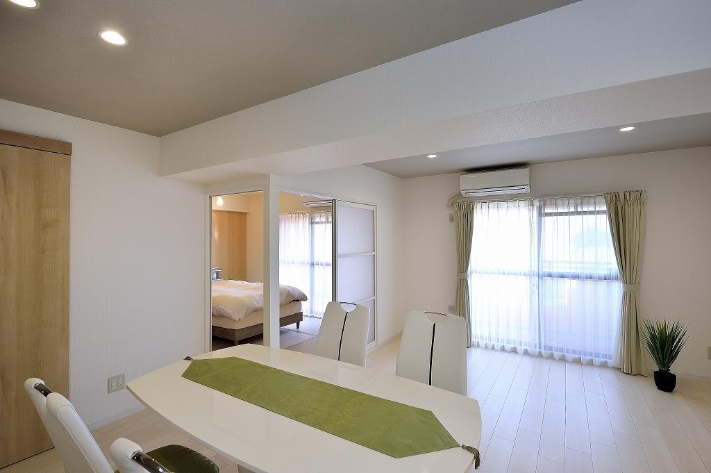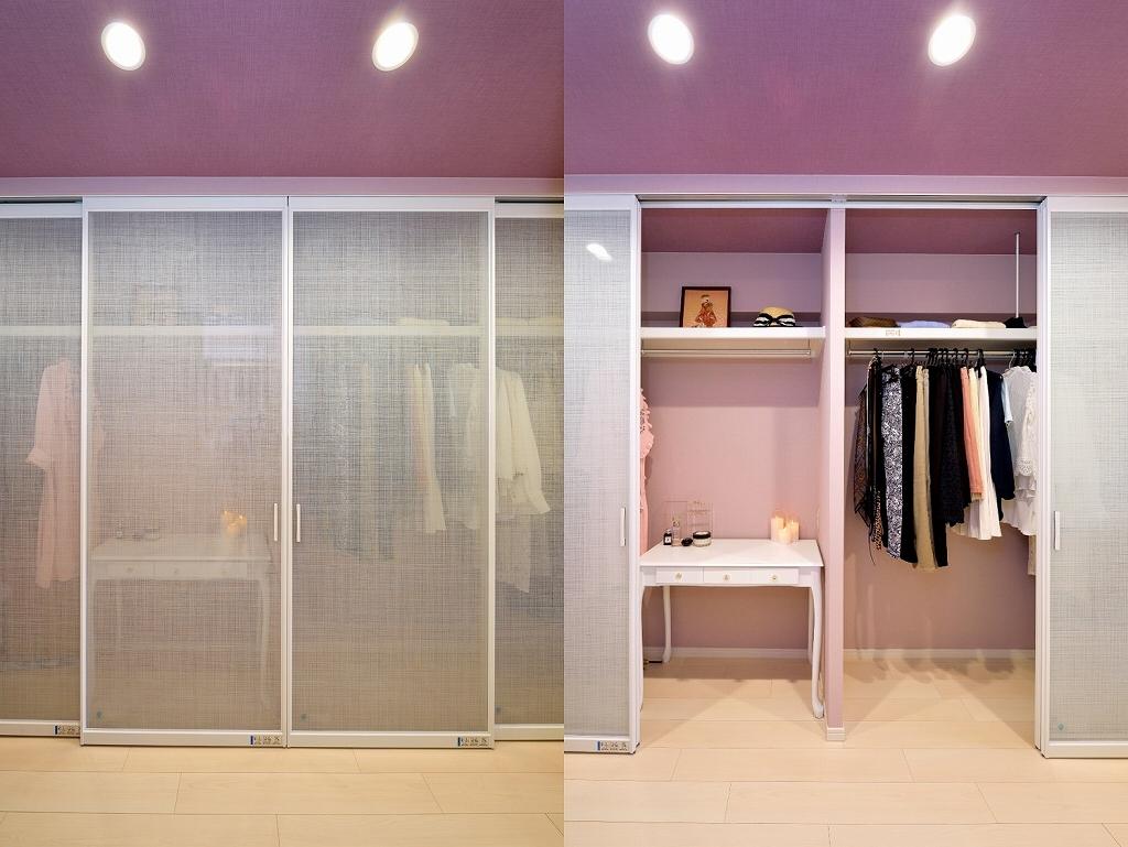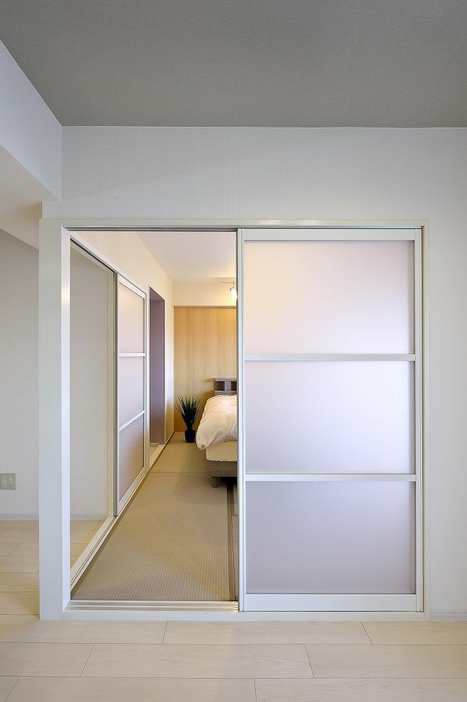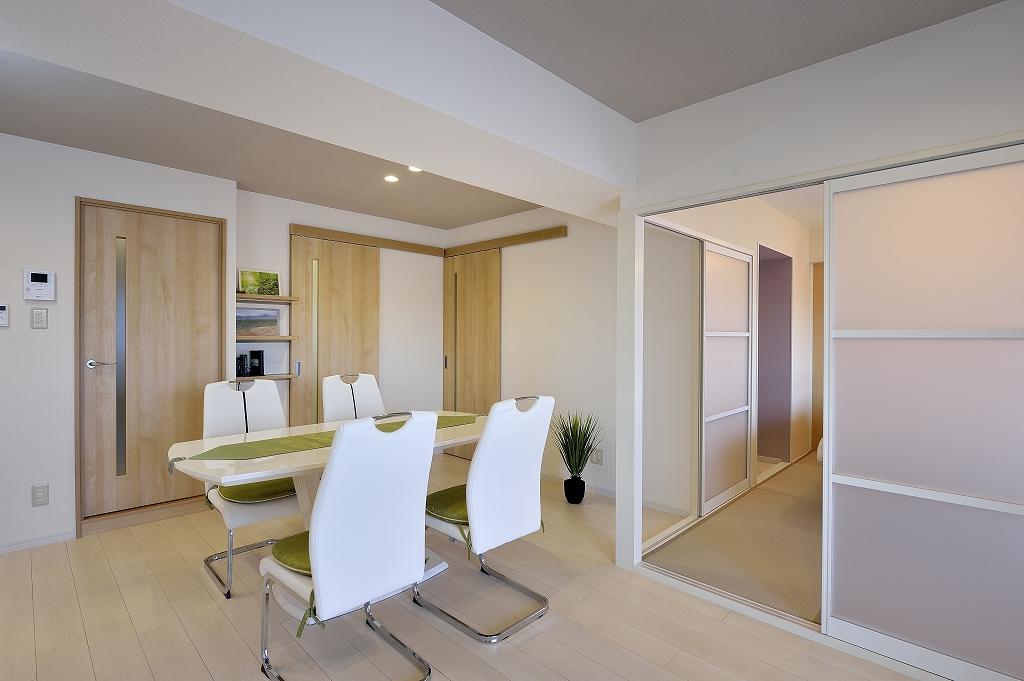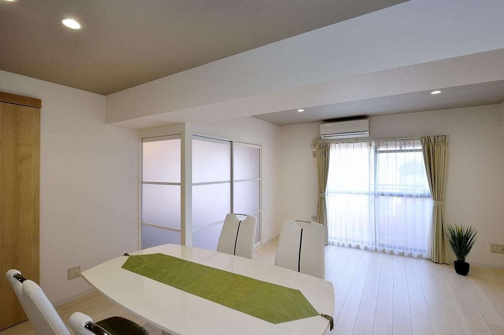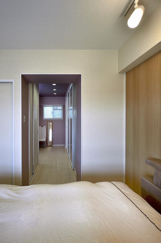 所有されていたマンションをリフォームして賃貸に出すかご自身で住むかを迷われていたKさま。快適に暮らせるように、まずはダイニングの隣にあった洋室の間仕切りをなくして広いLDKを作り出しました。洗面室は出入り口を変え、一回り大きな洗面化粧台を配置できるように変更。リビングの隣にある和室はモダンな畳を採用して、洋風の生活スタイルに馴染む雰囲気に。建具も半透明のものに変えて圧迫感を解消しました。室内の建具はなるべく高さをそろえることで、空間に統一感を出し、すっきりと広く見えるようにしています。また引き戸を多く採用し、普段は開けたまま、風通しよく過ごせるようにしました。そんな生まれ変わった住まいを見てご自身で住むことを決められたKさま。さらに暮らしに合わせたリフォームに着手し、洋室を思い切ってウォークスルークローゼットへ変更。大好きなラベンダー色のクロスを選ばれて、セレクトショップのような装いを再現しました。クローゼット内の引き戸は織物調の半透明のものを取り入れて明るい雰囲気に。高さもあるので、枕棚の荷物も出し入れがしやすくなり、より便利に使うことができるようになりました。「お気に入りの空間を見るたび嬉しい気持ちになります。寝室から直接アクセスできるので使いやすくて便利。」とたいへんお喜びいただけました。広くなったリビングでは趣味のヨガを楽しまれ、新しい暮らしを満喫されています。