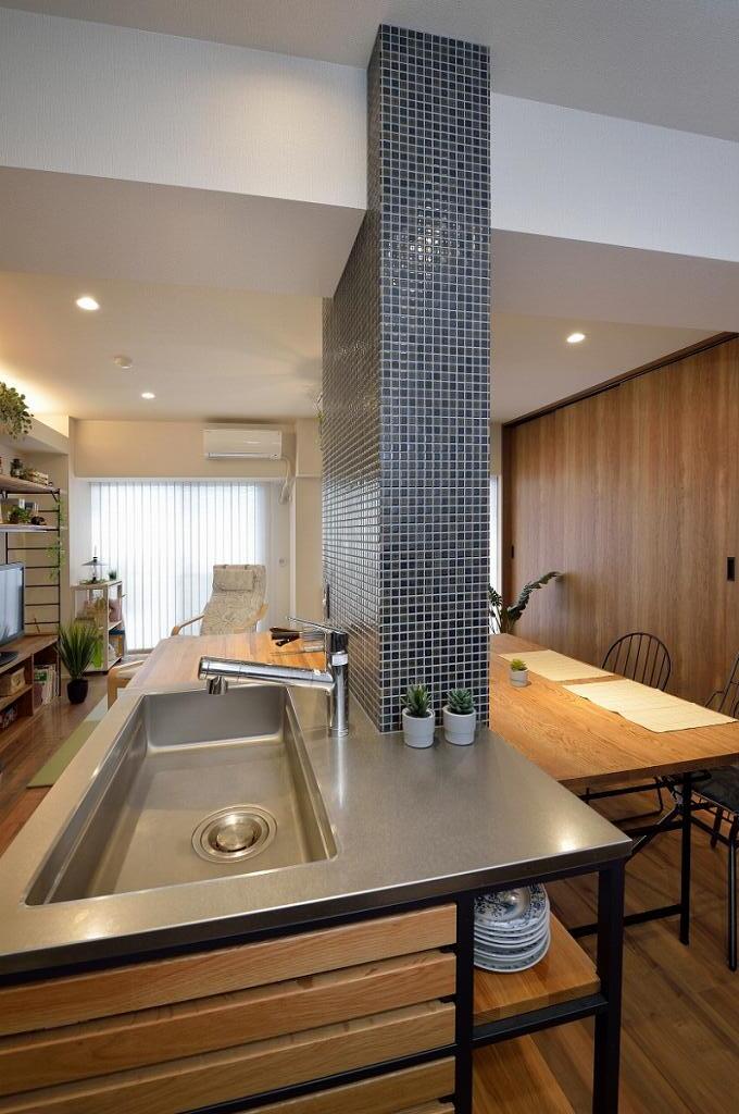 LDKのインテリアのキーとなったのは、黒い鉄のフレームと無垢の木の組み合わせが個性的なフレームキッチンです。壁側にコンロ、ダイニング側にシンクという2列配置にして、回遊性を持たせるとともに、ボリュームを小さく見せ、リビングに広がりを感じられるようにしました。キッチンの配管が通る壁にはモザイクタイルを貼り、空間のアクセントとしています。さまざまな素材がやさしく調和したカフェ風インテリアに仕上がり、この雰囲気に合わせてダイニングテーブルやシェルフなどのリビング家具も新調されました。フェイクグリーンや自然素材のカゴなどを少しずつ買い足しながら、インテリアを楽しまれています。また、今回のリノベーションを通して、ご自身のインテリアの好みを再認識され、「インテリアで遊ぶのが楽しくなりました!」と嬉しいお言葉をいただくことができました。