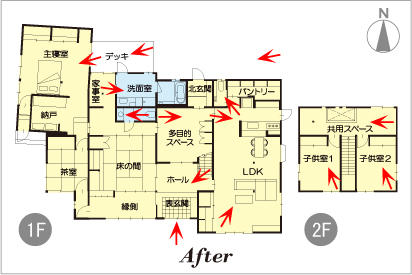 T様はお子様2人と4人暮らし。2階にお子様たちの部屋をまとめ、1階にその他を構えるゾーニングとしました。南に面する表玄関と床の間、茶室の位置はそのままとし、多目的スペースを中心に東にLDK、北に水まわり、西に主寝室を配置しています。多目的スペースは吹き抜けを通して2階の子供たちの共用スペースにもつながっており、この家の要となっています。