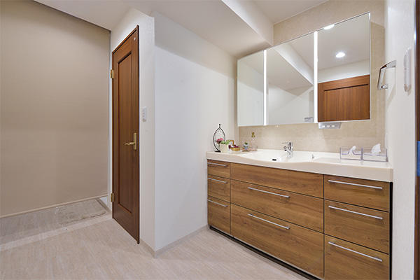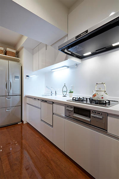 お子様が独立されたのを機にご夫婦二人でゆったり過ごせる家にとリフォームすることになりました。浴室を広げたい、玄関からリビングの動線を短くしたい、非日常的な空間にしたいとのご希望でした。キッチンを移動して、玄関、リビング、寝室から洗面室へ一周できる動線ができ、無駄な廊下がなくなり空間に余裕ができました。暗かった玄関は洋室の窓を取り込み贅沢な玄関ホールに生まれ変わりました。