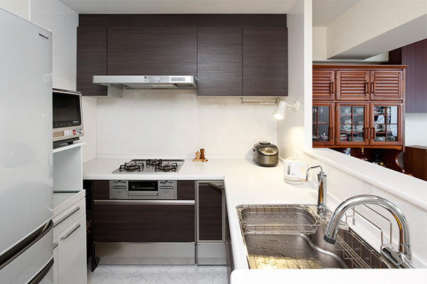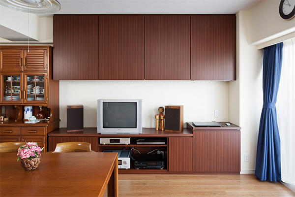 ダイニングテーブルに陽の光がさしこむリビングダイニングを、バルコニーに面して造りました。屋外に面してほぼ一面を最高抜群の窓に。インテリアは壁面にまとめて、開放感と明るさを感じさせるLDKです。