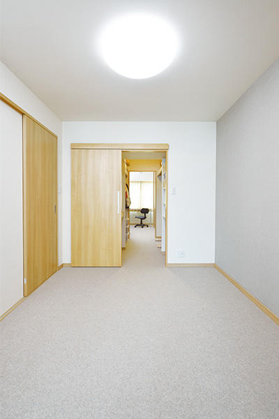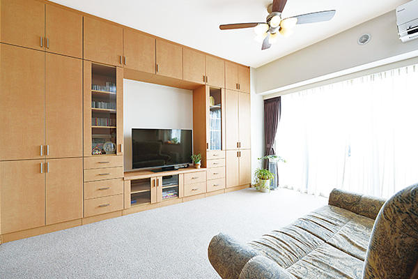 明るい光が差し込むリビング。壁面一体の造り付け収納棚は、豊富な収納力を確保しながら省スペースでお部屋を広くすっきり使えます。扉は強い揺れを感じると自動的にロックがかかる耐震ラッチ付きで安心。「お客様をお招きして感想を聞くのが楽しみです」とS様。