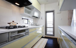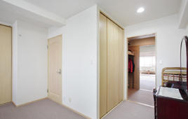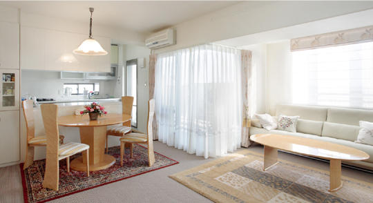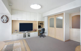 リビングを広げて、キッチンとの間仕切りをなくした代わりに収納ユニットで仕切りました。背面がリビングから見える為、食器棚家具の面材と同じものを使っています。柔らかなアイボリーの建具に対してブラウンの模様入のカーペットが高級感をかもし出します。小さく分かれた部屋の間仕切りを変え、回廊式にしたことで北側のお部屋の風通しも良くなりました。