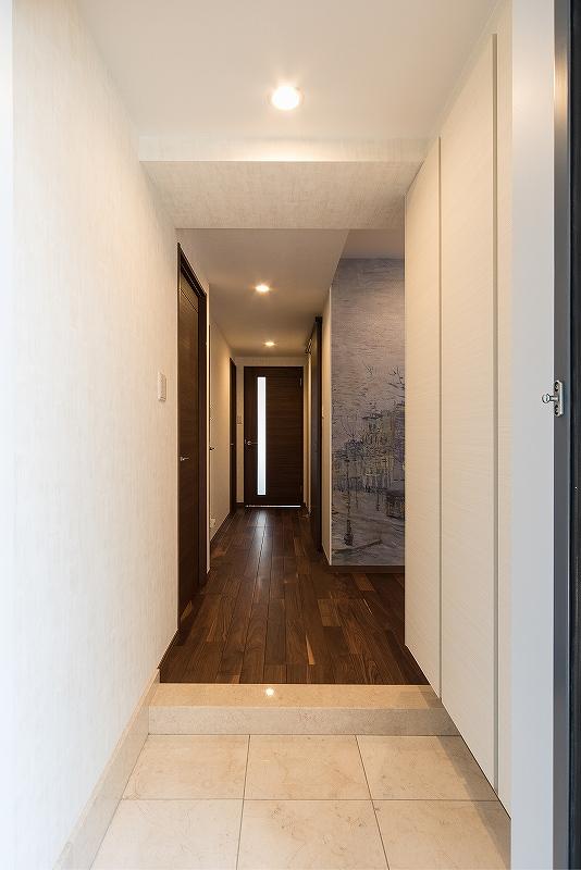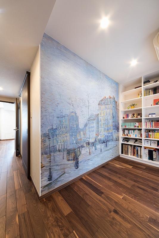 玄関は従前の洋室の窓を採り入れ、広がりのある空間へ。加えて施主がセレクトしたゴッホの壁紙を施工。住まい手の暮らしをイメージさせる象徴的なエントランスへ。