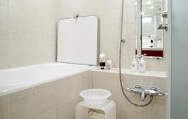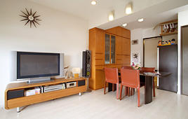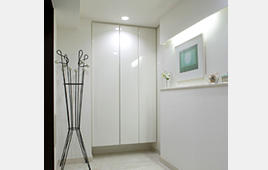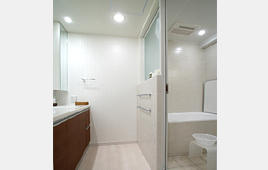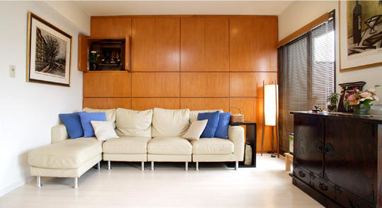 リビングのフローリングをアイボリーの石目柄に変更。玄関の大理石や水廻りのクッションフロア等、床の色は全てこの色に合わせ全体の統一させました。配管スペースやデットスペースのすきまを有効に利用して水廻り機器のサイズアップも実現。ユニットバス内もオリジナルの床壁材で揃えています。お好きなものやご家族の思い出の品が各所にちりばめられた癒しの空間です。