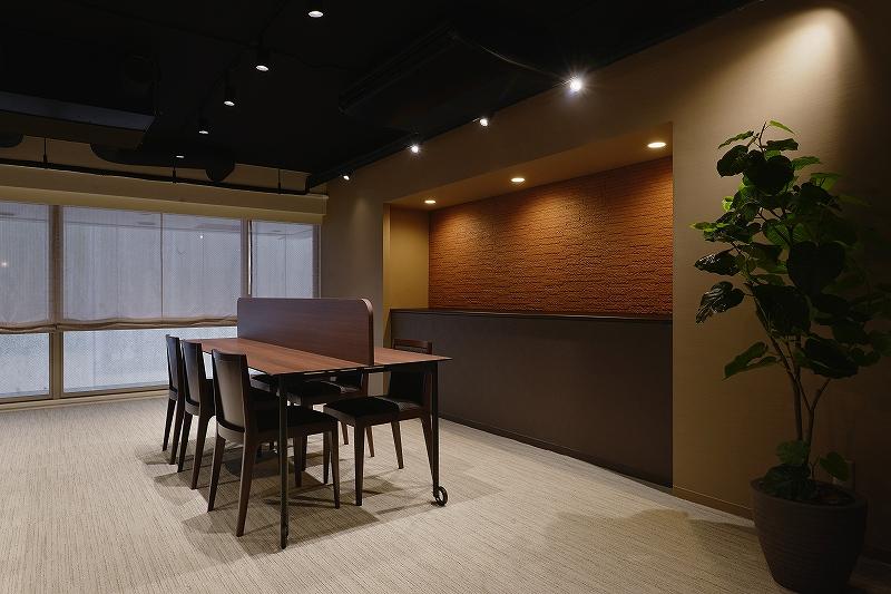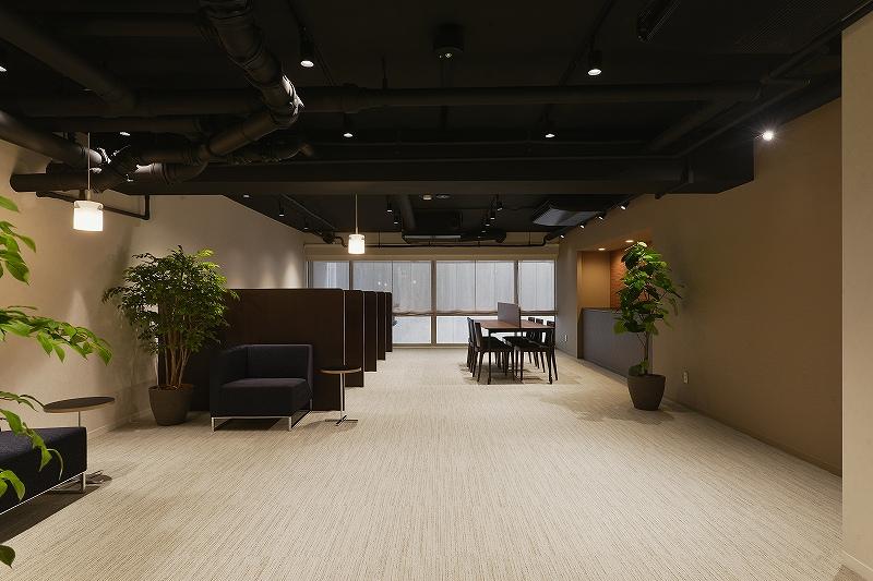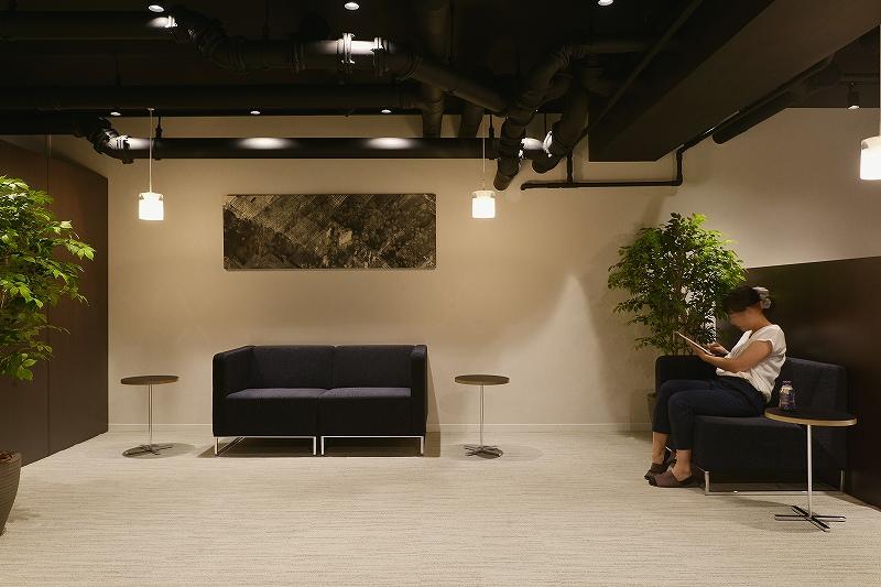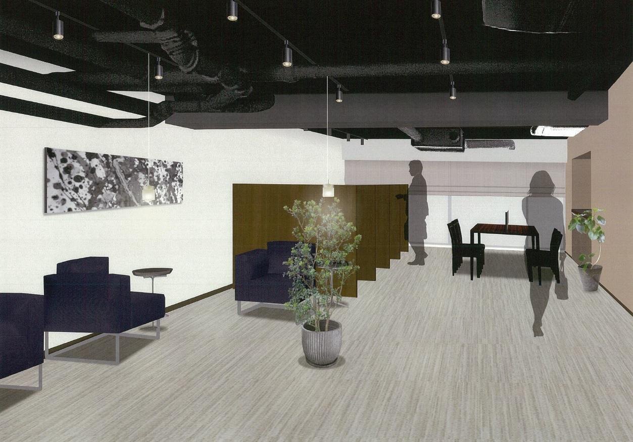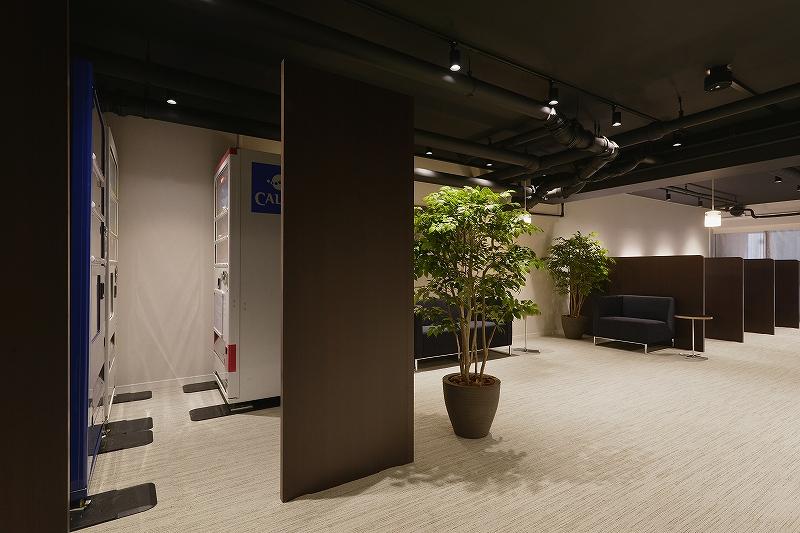 入口側に自動販売機をまとめ、くつろぐ際に視界に入らないようパーテーションで仕切り、手前は談笑スペース、奥にワークスペースを配置し、住人の方が気軽に立ち寄れるコミュニティスペースとなりました。