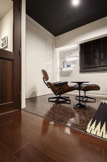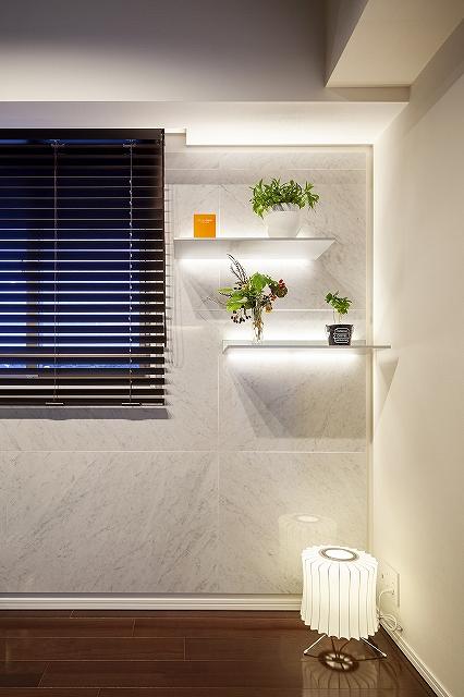 主役は壁の大理石パネルとLEDを組み込んだガラス棚。石の種類、サイズにこだわられ、当社担当者がお持ちしたものも含め色々ご覧になった上で決められました。そこにレザー調クロスやウッドブラインドで黒を効かせて、空間にクールさと落ち着きをプラス。間接照明を取り入れ、柔らかく広がる光でリラックス感を演出しています。
