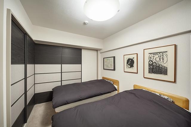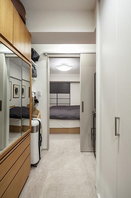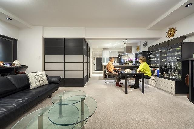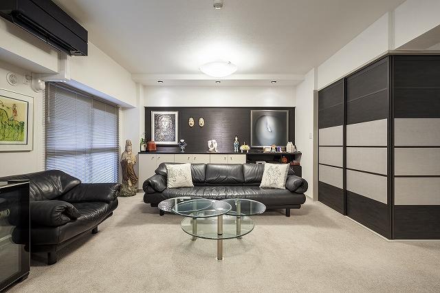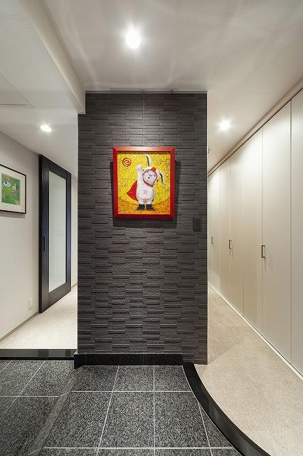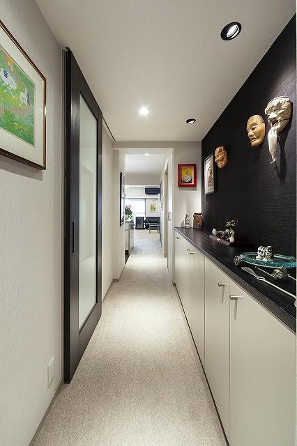 収納スペースになっていた洋室を思い切って取り除き、広々とした玄関、そして住まいに光と風の流れを作りました。内装は色やデザインにこだわり、ご夫妻のセンスが光る住まいになったと思います。そして部屋の壁やカウンターにはご主人の作品である能面や今まで収集してきた個性あふれる絵画や美術品がさりげなく飾られ、まるでギャラリーにいるような、ふっと笑顔になれる素敵な住まいです。私自身、とても刺激になりこのリフォームに携わることができ心より感謝しています。M様ありがとうございました。