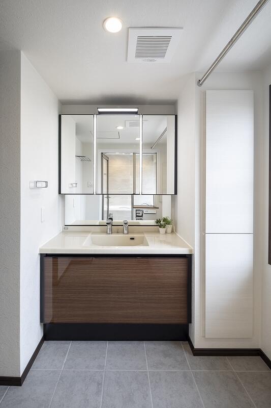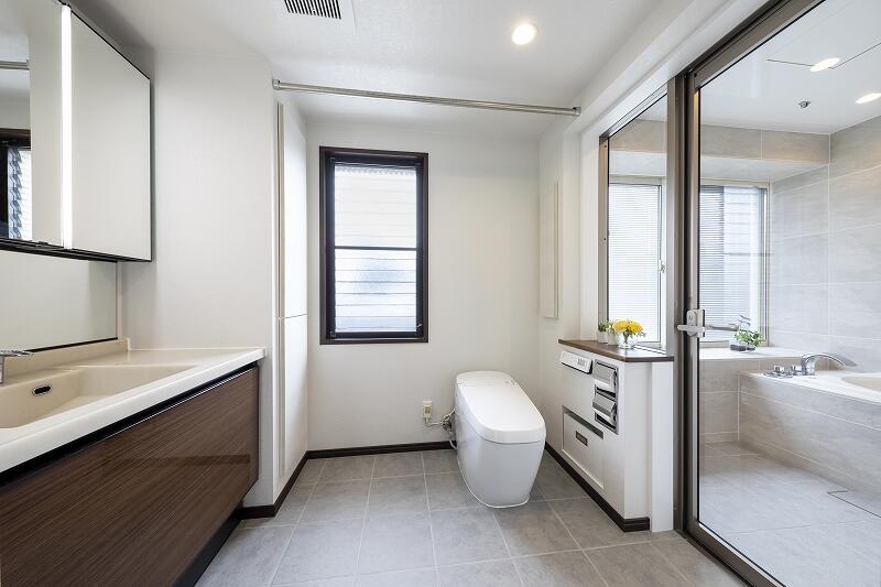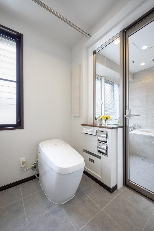 大きな窓を活かせるシステムバスに、二重サッシ、保温浴槽、冷たさを感じにくい床等を追加。ゆっくり寛げる落ち着いた雰囲気にしたいとのことで、ショールームでご覧になって気に入られた壁のタイルに合わせてシックなトーンでまとめました。ガラス越しにつながる洗面脱衣スペースにも同じデザインの床タイルを貼り、洗面化粧台、トイレを一新。同時に収納を充実させたオーダーメイドのバスルームです。