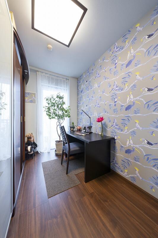 各お部屋に置かれた観葉植物の鮮やかなグリーンと、壁紙の大胆な色づかい、植物や鳥のモチーフとが相まって、生き生きとした空気感が心地よいA様邸では、「毎日が楽しい」と奥様。