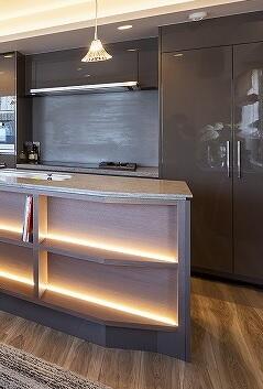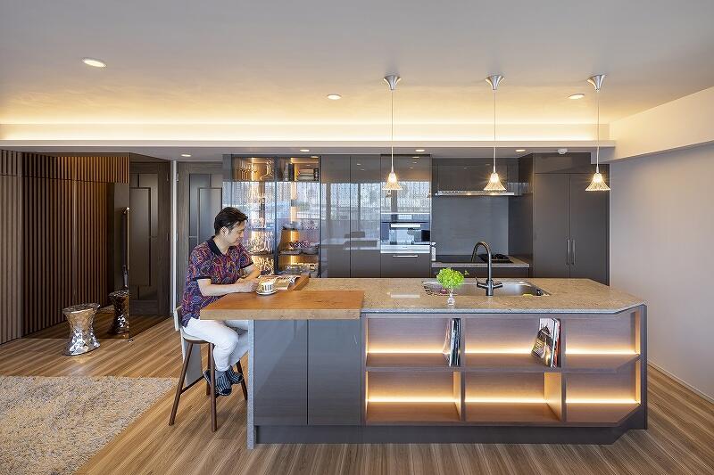 現在、内装デザイン関係のお仕事をされているご子息様がデザインを担当し、それを再現していく形で施工方法を検討させていただきました。リビングは間接照明を配置することで、よりくつろげる空間となり、時間の流れを忘れるほどの居心地の良さ、まるでリゾートの別荘にいるかのように感じられます。こだわりのアイランドキッチンはコーナーカットをしたことで、冷蔵庫へと続く動線を遮らず、また、カウンターを造り付けることで簡単な食事もとれるようにデザインされました。