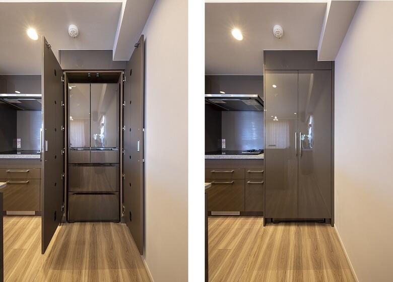 C)冷蔵庫も扉付き。来客時にはスッキリとした空間に。