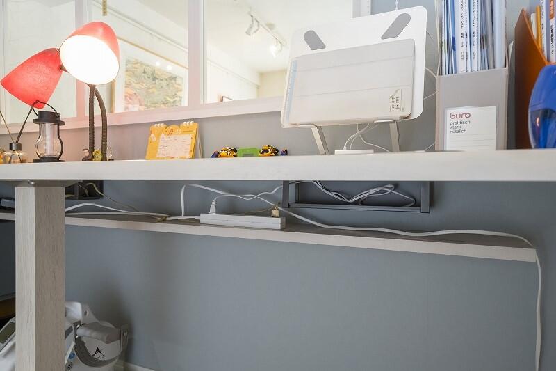 カウンターの奥行・高さ、脚の配置、パソコンや周辺機器の配線を落とす位置までこだわって、お二人にとって使いやすいデスクを追求しました。S様のアイデアで、コードやタップを受ける専用の棚を設置。足元がすっきりと片付き、お掃除もしやすくなっています。