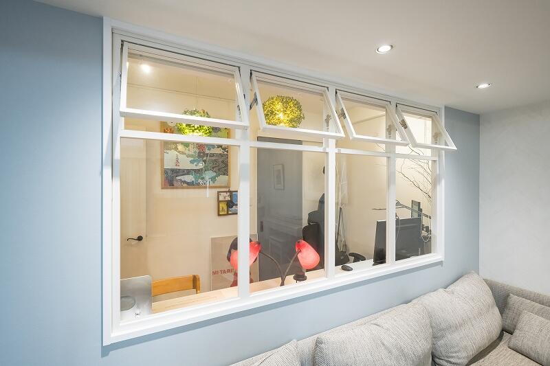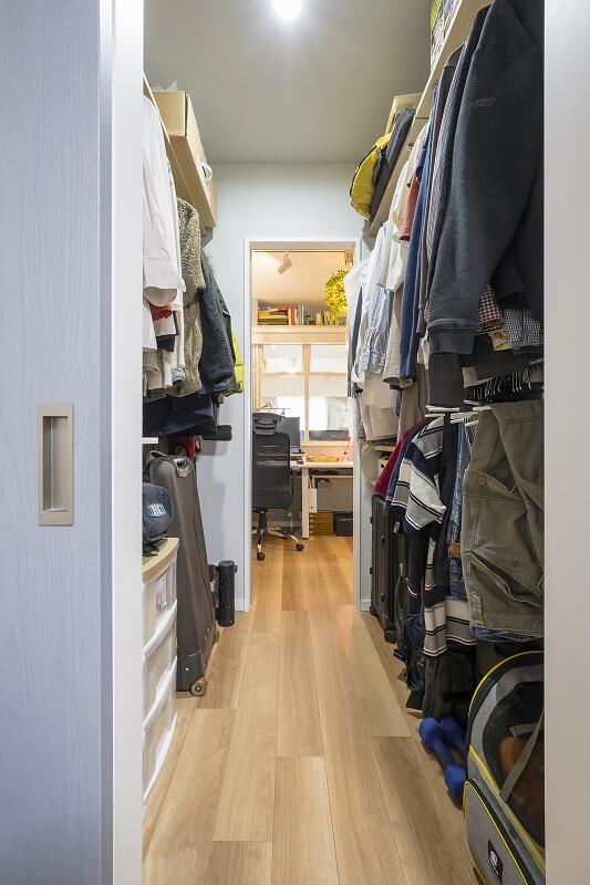 約4畳分を間仕切り、大きな窓でリビングとゆるやかにつなげたことで、どちらからも抜け感と奥行が感じられる開放的な空間を実現。廊下からだけでなく、クローゼット経由で寝室からもアクセスできるスムーズな動線、デスクまわりの使いやすさにもこだわっています。