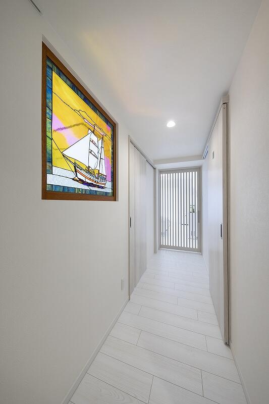 ご両親が住まわれていたマンションを相続し、リフォームして暮らそうと考えられたK様ご夫妻。お母さまがご趣味で制作されていたステンドグラスをいつでも眺められるよう、壁に埋め込みたいとのご要望をいただきました。リフォーム完成後、実際に見てみると洋室の光が廊下に入って明るい上、デザイン性も上がり、美術館のような空間となりました。